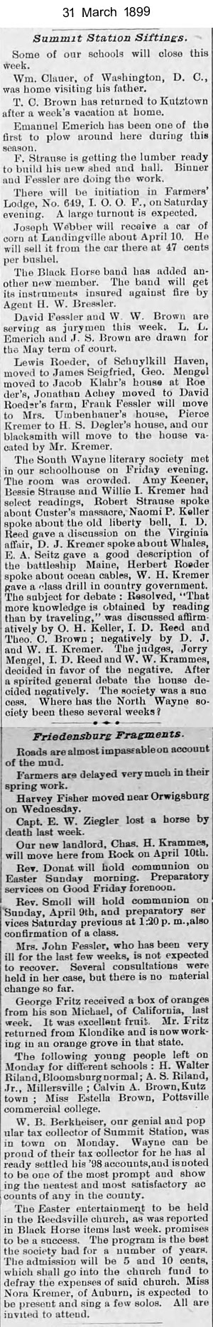 J.A. Heffner’s General Store was located on the south side of Main Street, directly across from the present-day Friedensburg Fire House. The store was originally operated by Mr. Kreck and Mr. Brown. The building still stands today and has since been converted into apartments.